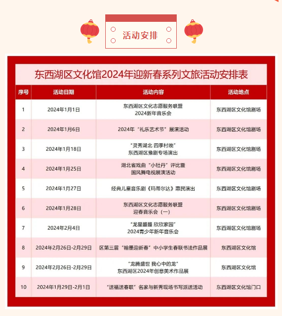 告别繁忙而又收获满满的2023年,充满美好与挑战的2024年近在眼前。在这辞旧迎新的时刻,东西湖区文化馆诚挚邀请您,高举文化的火把,点燃新年希望,体验一系列与众不同的新年盛宴。
